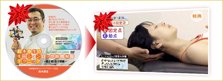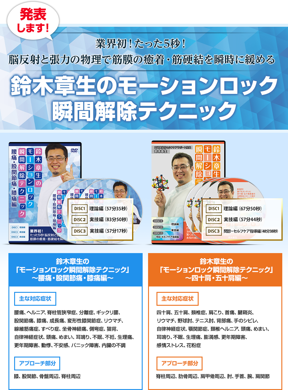 また、鈴木先生が今回公開してくださった「モーションロック瞬間解除テクニック」は、これまで誰も見出せなかった業界の概念を逸脱した完全オリジナルな治療法です。