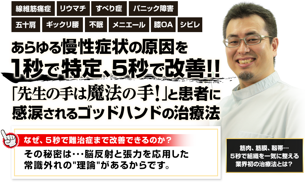 この手技は簡単に症状を取れるのはもちろんですが、患者さん本人も忘れているような何年も何十年も前の原因を簡単に見つけられるんですよ。だから簡単に、「ゴッドハンド」と呼ばれることができます。