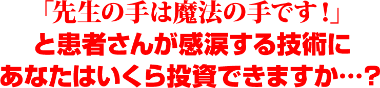 鈴木先生がこの治療法を開発するまでには、数年に渡る研究に研究を重ねた期間や臨床数、今まで参加してきたセミナーの金額、新しい気づきを得るための物理学など他業界の勉強の時間を踏まえると…