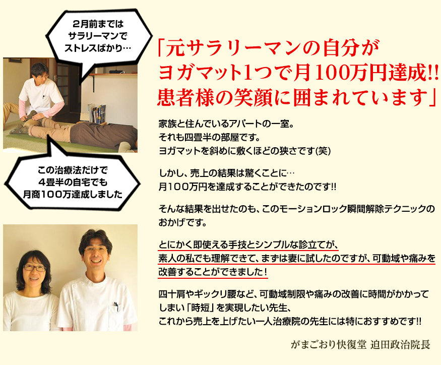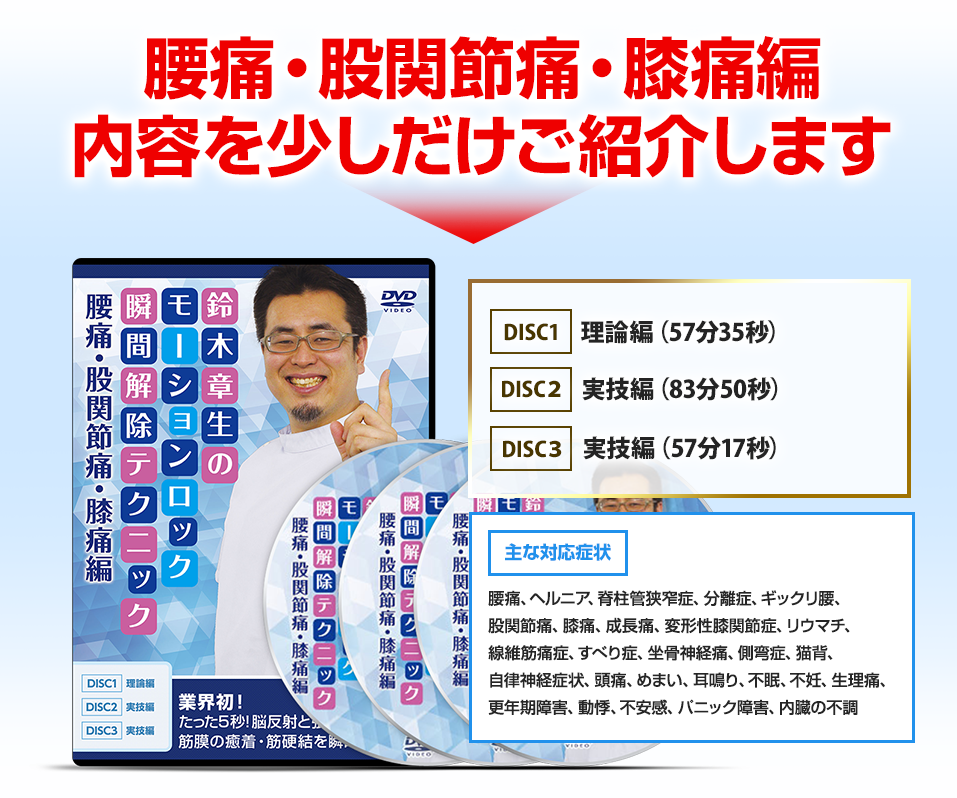 また、鈴木先生が今回公開してくださった「モーションロック瞬間解除テクニック」は、これまで誰も見出せなかった業界の概念を逸脱した完全オリジナルな治療法です。