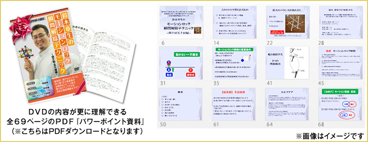 そんな思いで鈴木先生が「モーションロック瞬間解除テクニック」の理解をさらに深めて頂くためにDVDの内容をパワーポイントの資料にしてまとめてくれました。
