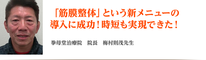 私の治療院では昔ながらの指圧施術があるのですが、それがすごくハードです。今回鈴木先生の手技を習ったので、新しく筋膜整体とか筋膜遮絶という名前に変えて新しいメニューを作りました。時短はもちろん、体力的にすごくラクになりました。